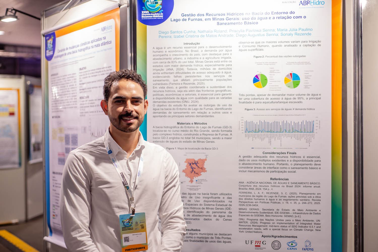 Complementando as atividades, no dia 25 de novembro foi apresentado o pôster “Gestão dos recursos hídricos na bacia do entorno do Lago de Furnas, em Minas Gerais: usos da água e a relação com o saneamento básico”, de autoria de Diego Santos Cunha. O trabalho destacou as interações entre diferentes usos da água e os desafios para uma gestão integrada que considere tanto aspectos ambientais quanto sociais.