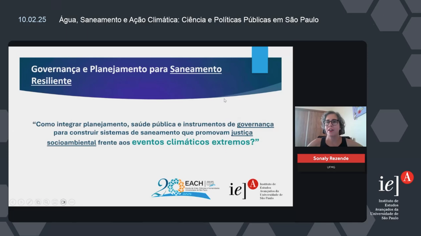 A programação incluiu duas mesas principais de debate. Na mesa “Governança e Planejamento para Saneamento Resiliente”, foram discutidos os desafios institucionais para a construção de sistemas capazes de responder de forma eficaz aos eventos climáticos extremos. Representando o grupo Mar de Nós, Sonaly Rezende (UFMG) participou como debatedora, contribuindo remotamente para a reflexão sobre integração entre planejamento, saúde pública e instrumentos de governança.
